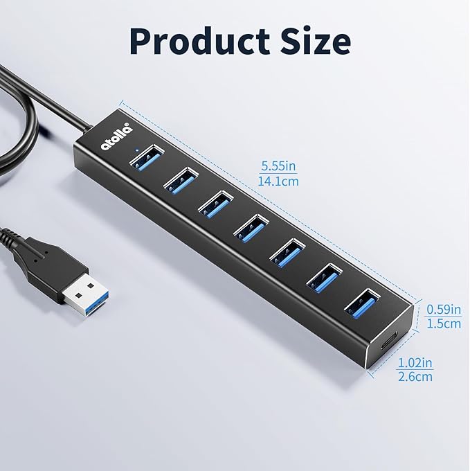 atolla Aluminum 7-Port USB 3.0 Hub with 1m Extension Cable - 5Gbps High-Speed Data Transfer for MacBook Pro, Laptop, PC, Gaming Setup