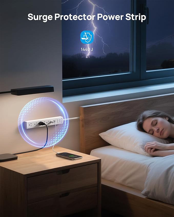 - Power Strips with Surge Protection: The power strip surge protector provides multiple safety protections: 1440J surge protection, intelligent overload protection, rapid short-circuit protection, and fire-resistant casing, safeguarding your valuable electronic devices from potential damage caused by power interference