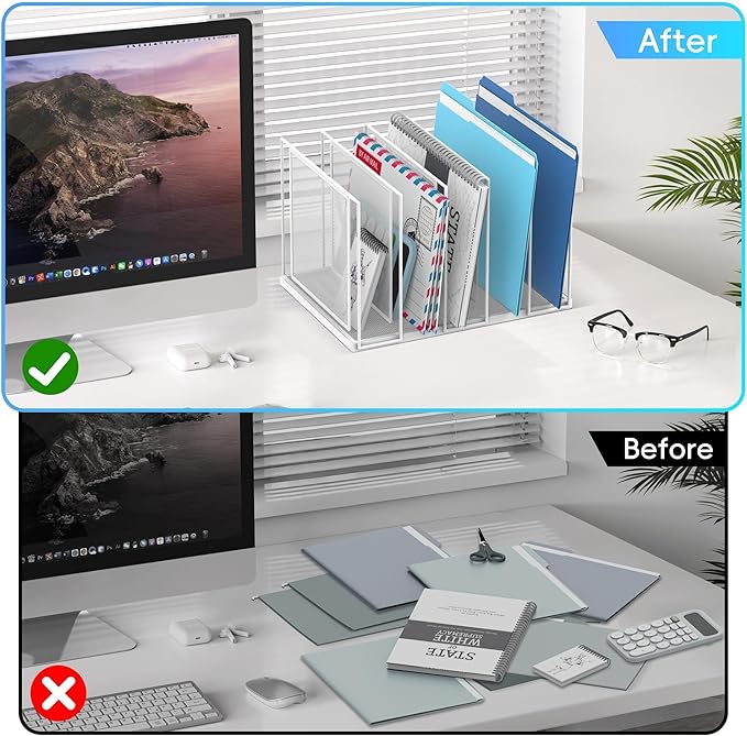 - [High Quality & Durability] The sturdy metal frame and durable steel mesh provide support and stability no matter how many items you put on this vertical file holder. The high-quality powder coat helps resist chipping or scratching, protect your desktop while still beautiful.