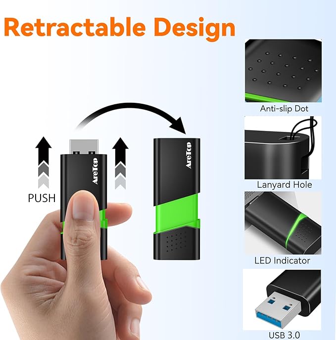 - RETRACTABLE DESIGN:The flash drives 5 pack are made from superior ABS plastic. The glide style makes usb drive easy to use and protects the connector from damaging, don't worry about losing the cap.Anti-slip wave dot design at Push-Pull position makes it convenient for you to hold and plug