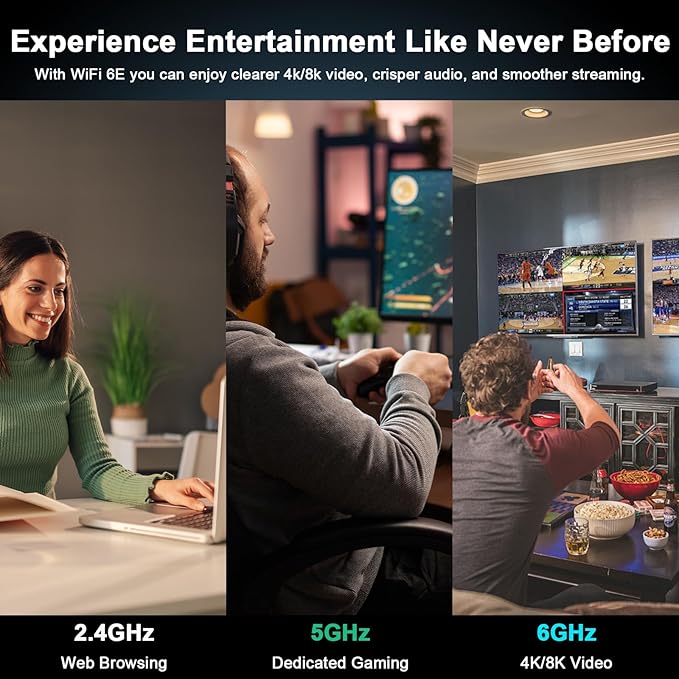 - 【Shocking Tri-Band Transmission Speed】The Wireless Network Adapter offers lightning-fast speeds of up to 5400Mbps on the WiFi 6E standard, providing 2402 Mbps on both the 6 GHz and 5 GHz bands, or 574 Mbps on the 2.4 GHz band for seamless connectivity. Whether watching high-definition streaming videos or playing 3A games, stable transmission can be maintained. Ensure a better user experience for you