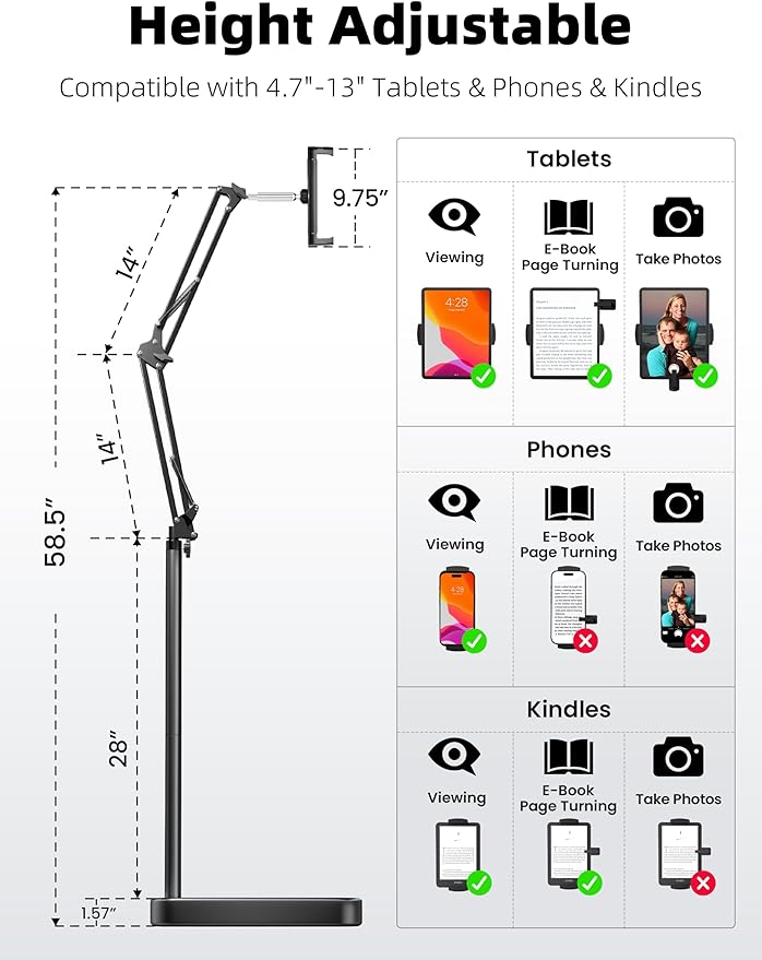 - 【Perfect Kindle Stand】This tablet stand features a dual-support structure and a heavy-duty 11-pound base for rock-solid stability. Whether you're lying down, sitting, or standing, the flexible arm adjusts effortlessly to your perfect angle on the bed, sofa, or recliner—without tipping over.