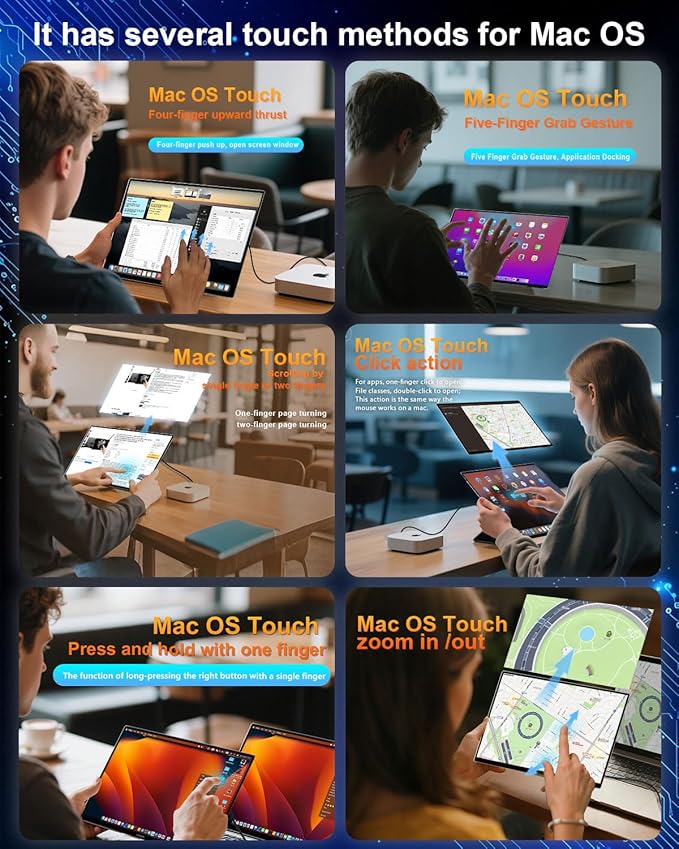 - 【Touch-Enabled Portable Monitor Designed for Mac】 Catsights One offers full touch control for macOS, supporting: One-finger: swipe, drag, double-tap. two-finger: Zoom in/out, four-finger swipe for app switching, five-finger pinch for Mission Control. MacBook-level touchpad functionality—smoother after installing the Catsights app (download via manual/guide image). Note: Windows/Android/iOS/iPad devices deliver equally fluid touch without app installation(Compatible with macOS 14.1 and above).