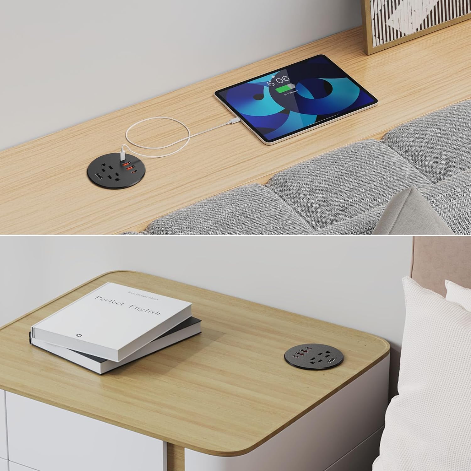 - 【7-in-1 Desktop Power Grommet】This desk power grommet features 2 AC outlet, 2 PD 35W USB-C fast charging ports, and 2 QC3.0 30W USB-A ports, and 1 HDMI port, it comes with a 45-degree flat plug. Great addition to the nightstand or furniture table.
