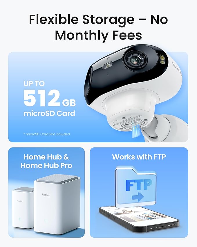 - LOCAL STORAGE & HOME HUB COMPATIBLE: Store all your recordings locally on a microSD card (Up to 512GB, buy separately) or the Reolink Home Hub (supports up to 2x512GB microSD cards). RTSP/NAS Home Assistant are supported when it paired with Home Hub/Pro.