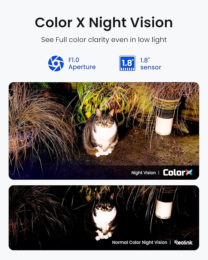 - COLORX FULL COLOR NIGHT VISION: ColorX enables full-color night vision with F/1.0 aperture and 1/1.8 sensor for true-to-life details. This solar camera delivers 4K ultra-high-definition full-color night vision without needing spotlights or infrared, making night scenes as clear as day.