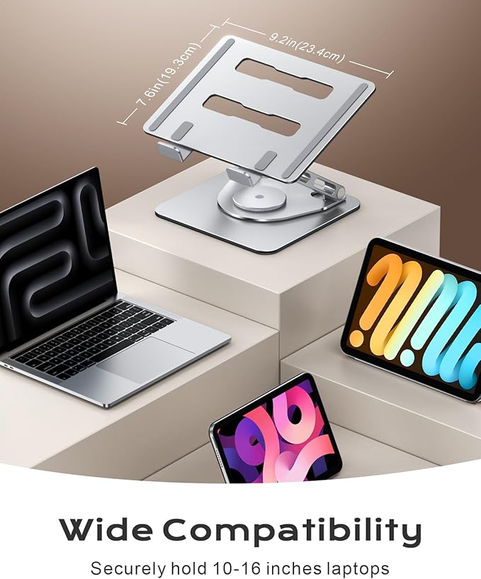 - [Ergonomic Comfort] Designed for comfort and health, this laptop stand for desk allows you to adjust height and angle for an ergonomic viewing experience. Elevate your laptop screen to a healthy posture height (1.88-9.88") to relieve stress on your back and neck.