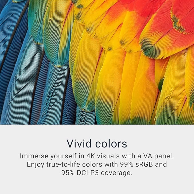 - Vivid colors: Immerse yourself in 4K visuals with a VA panel. Enjoy true-to-life colors with 99% sRGB and 95% DCI-P3 coverage. The 1500:1 contrast ratio and HDR readiness deliver excellent depth and detail.