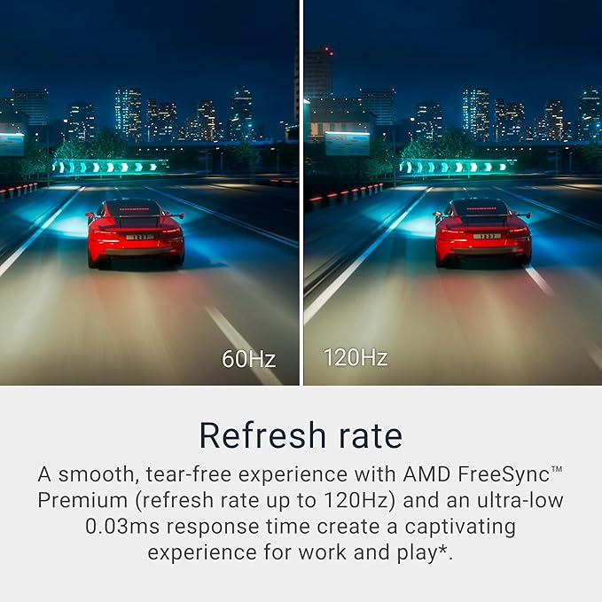 - Refresh rate: A smooth, tear-free experience with AMD FreeSync Premium (refresh rate up to 120Hz) and an ultra-low 0.03ms response time create a captivating experience for work and play.