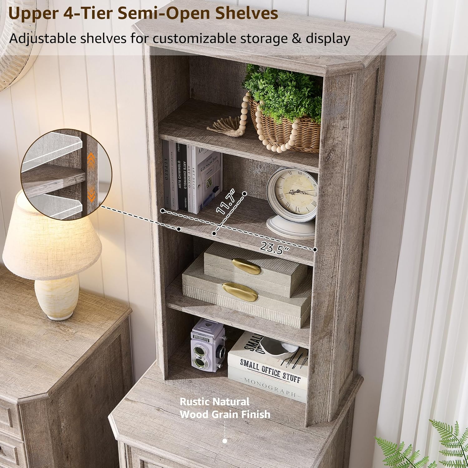 - 4 Adjustable Open Shelves & Spacious Display Surface: This wooden bookshelf with storage features four adjustable semi-open shelves, each with three height settings (up or down 2.5"), allowing you to customize shelf spacing between 7.2β-14.7β to fit books, trophies, decorative items, and frequently accessed items. The 23.5-inch wide tabletop expands your display area while bringing a touch of warmth and farmhouse style to your space
