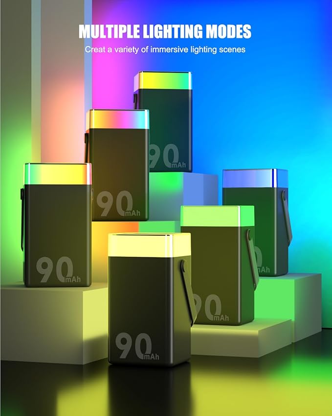 - 1. 4-IN-1 90000mAh Power Bank & RGB Mood Light & Table Lamp & LED Camping Lantern: Our power bank isn't just a 90000mahhigh capacity power bank, it also works as a RGB mood night light with 9 modes, table lamp with 3 modes, and outdoor LED Camping Lantern, emergency flashlight. Charge 5 Phones simultaneously; Built with UL-certified cells for safety and durability; Powers your smartphone about 10-20 times; Ideal for week-long camping trips