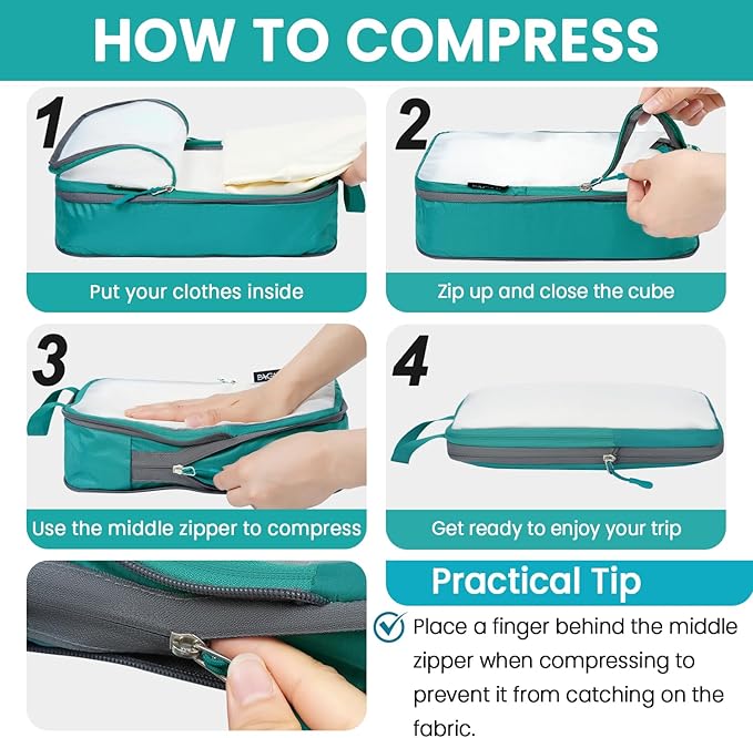 - How to Compress:The cube is compressed by the middle zipper; Using steps: 1)Fold and flatten clothes 2)Pack clothes in the cube and zip the front zipper 3) Put a finger on the back of the middle zipper when compressing to avoid zipper get stuck in fabric