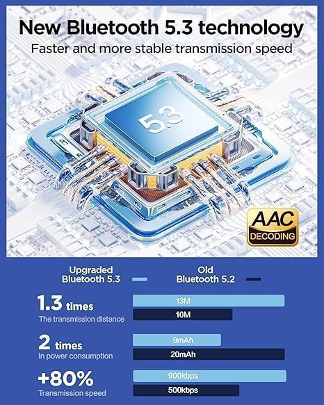- 【Bluetooth Headphones】: The wireless earbuds use the bluetooth 5.3 chipset. There is a faster and more stable signal transmission and has successfully achieved low latency without interruption. With a range of up to 10 m, whether you are at home, in the office, or on the road, you don't have to worry about disconnection of the bluetooth earbuds. Automatic pairing & compatible with multiple devices.