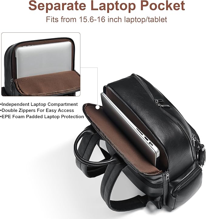 - MULTIPLE POCKETS - This laptop backpack women has multiple pockets for storage:1 main compartment containing:1 foam compartment,1 internal zipper pocket,2 internal slit pockets;1 special laptop pocket (fits 16 inch laptop);2 external side zipper pockets,2 front zipper pockets (total of 5 zip pockets for your small items).This leather backpack with multiple pockets can effectively help you organize your valuable devices and small items,making your backpack no longer messy.