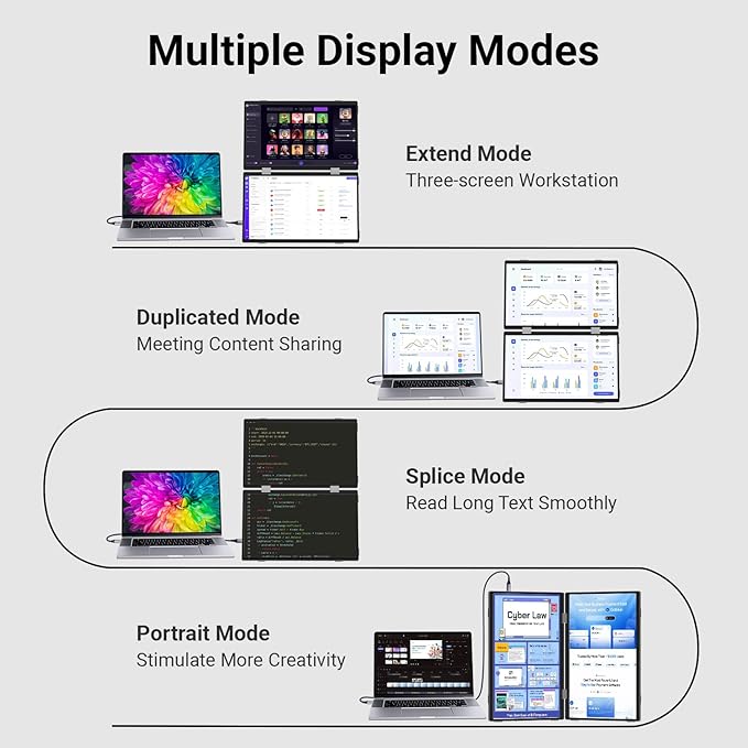 - Dual Screens, Boost 300% Productivity: Two 15.6”FHD IPS laptop monitor extender support extend, mirror, split, and portrait modes. Easily manage multiple tasks without switching tabs—ideal for professionals, coders, designers, and remote workers looking to boost efficiency.