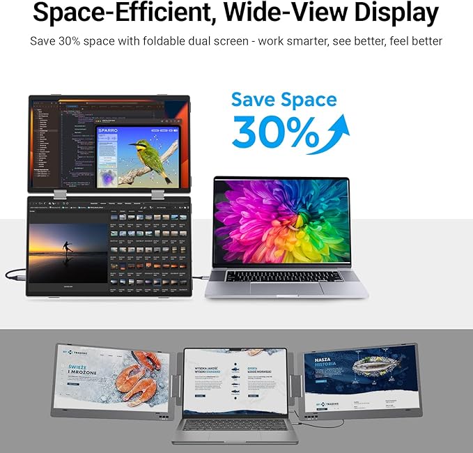 - Foldable & Portable for Travel: The dual monitor is lightweight and foldable with 360° rotation for flexible viewing and collaboration. Easy to pack and carry by hand or in your laptop bag—perfect for hybrid work setups, remote meetings, or mobile productivity.