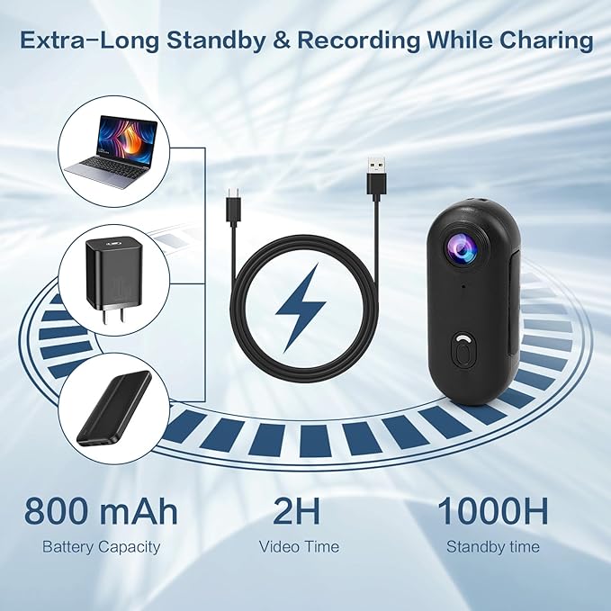 - Thumb-Sized Mini Camera with All-Day Power: Ultra-compact (64.5 x 28 x 20mm) but mighty: 800mAh battery supports 2-hour continuous 4K video. Magnetic pendant, safety cord, and rotating clip offer flexible mounting anywhere