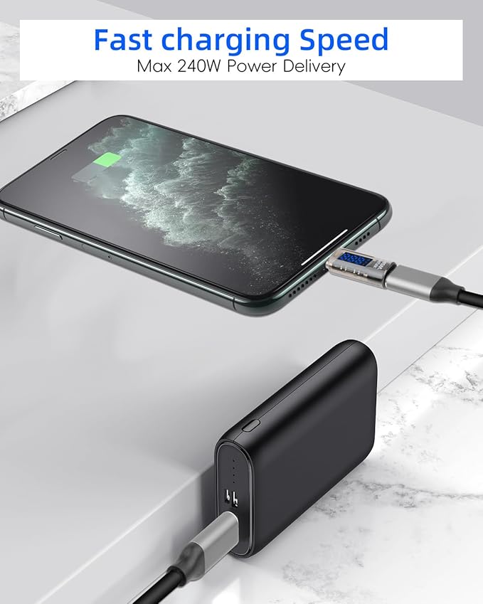 - USB C Male to USB C Female Adapter,this adapter has a built-in detection chip, supports PD3.1 fast charging protocol, and can reach 240W (48V/5A) power output,which can quickly fully charge your devices (including laptops)