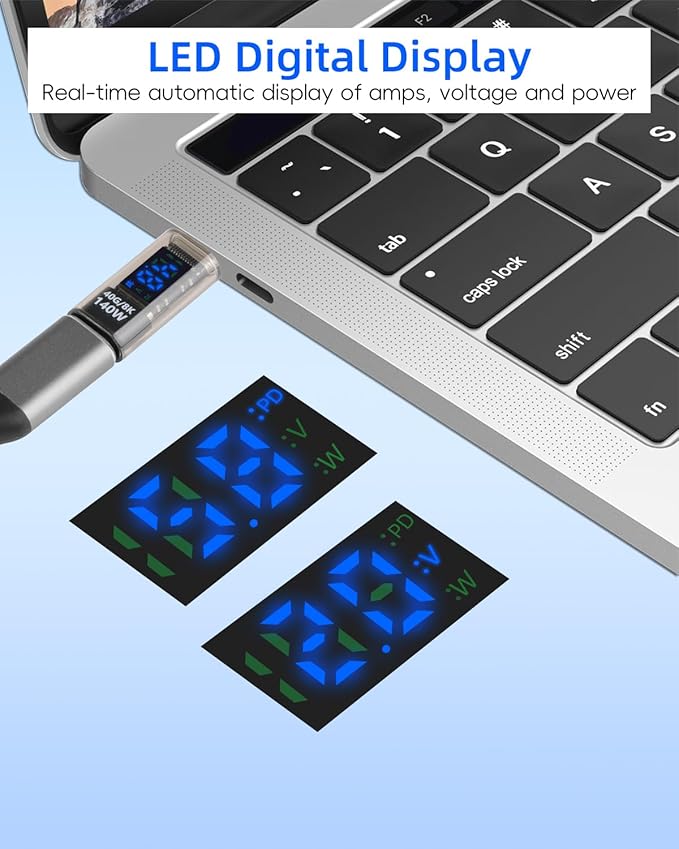 - USB C adapter has an intelligent digital display that automatically switches,allowing you to see the voltage,current, and charging power at a glance.