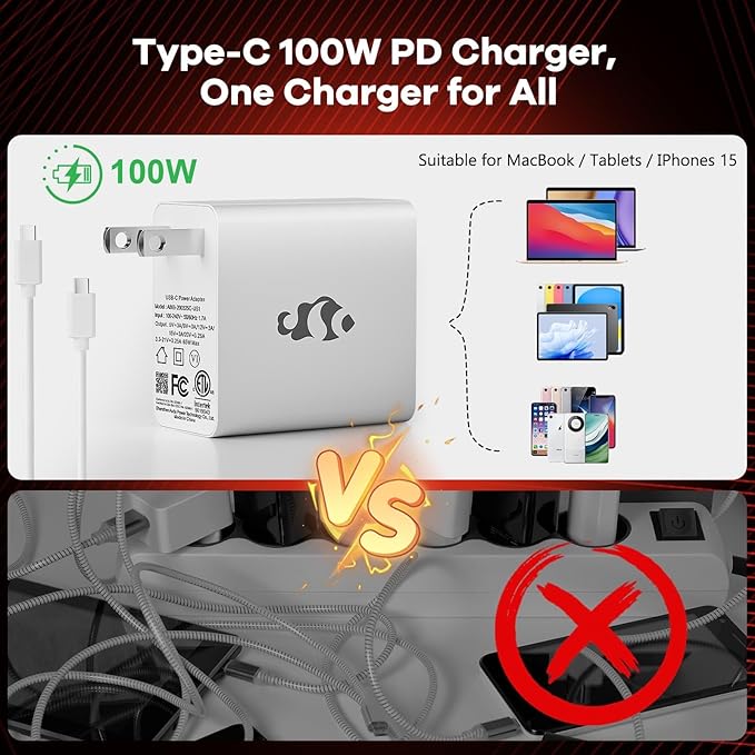 - 【100W Type-C PD charger】 Lightweight and Portable Laptop Charger - Fast Charging Without the Bulk and Inconvenience of Traditional Chargers. 100W Type-C PD Charger, One Charger for All. Suitable for Computers / Tablets / IPhones 15 / MacBook.【Multi-Connection】1x SuperSpeed USB Type-C, 3x SuperSpeed USB Type-A, 1x HDMI, 1xSD Reader, 1x Headphone/Microphone combo, Wi-Fi, Bluetooth.