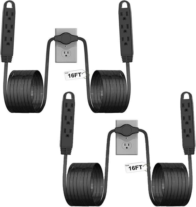 2 Pack 3-Prong 16FT Twin Extension Cord with 6 Outlets - Slim Design for Home Furniture, 16FT Double Cord 8 FT Each Side in Black Color