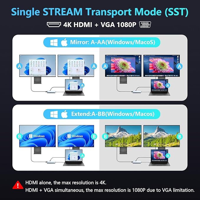 - 4K HDMI and 1080P VGA - The Aplimln usbc hub with HDMI and VGA supports high-definition displays, projectors, and more. The resolution is up to 3840x2160@30Hz (4K) when using HDMI alone, and is backward compatible with 1920x1080@60Hz (1080P), 1280x1024, 1600x1200, 720p, and more. When using HDMI and VGA at the same time, the resolution is limited by VGA up to 1080p. (Note: When using VGA and HDMI at the same time, one display will default to Mirror Mode and the other will default to Extended Mode.)