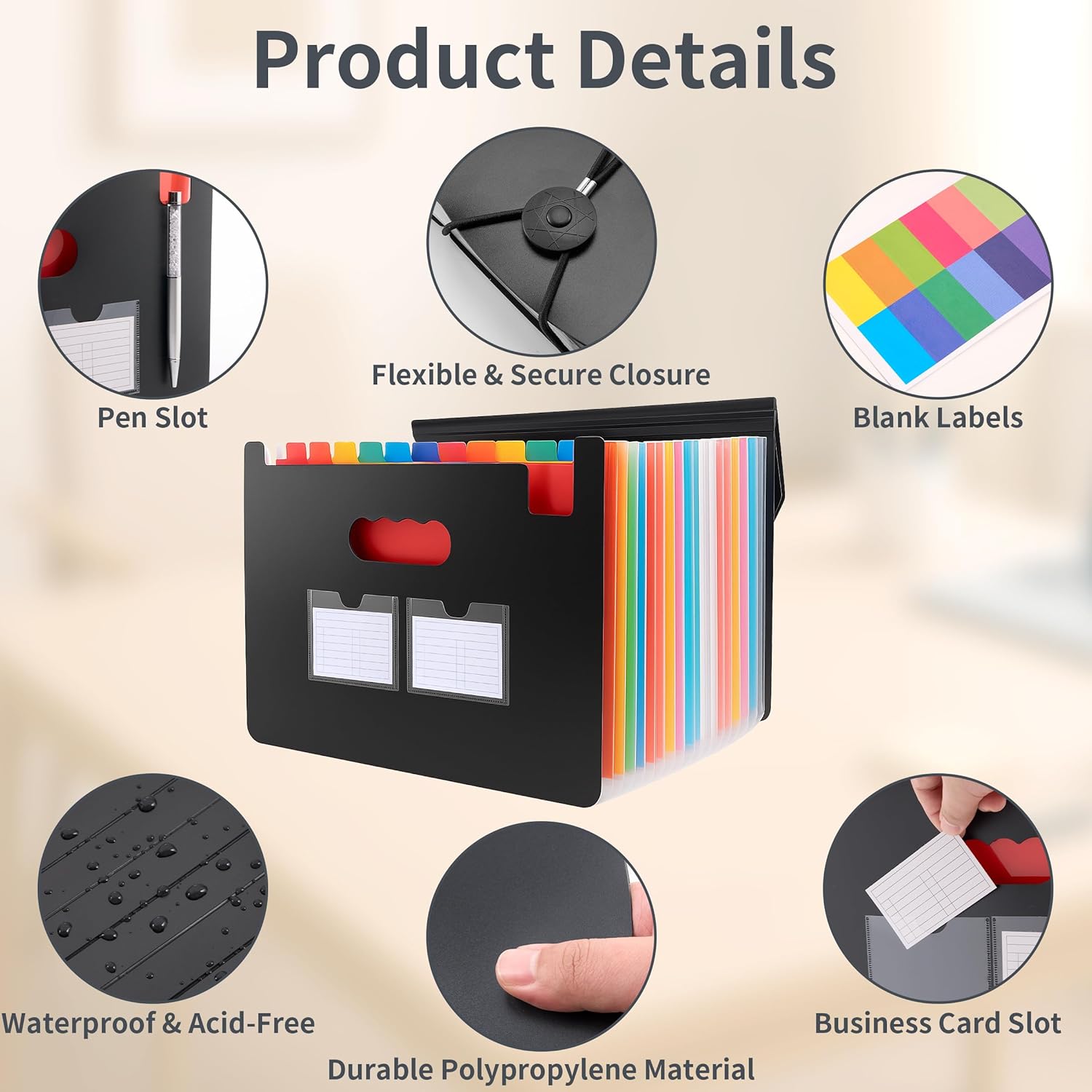 Accordion File Organizer, 2 Pack Secure Closure Expanding File Folder with 25 Pockets, Blank Labels and Colorful Inner Page, Large Waterproof Quick Access Folder Organizer for A4/Letter Size, Black