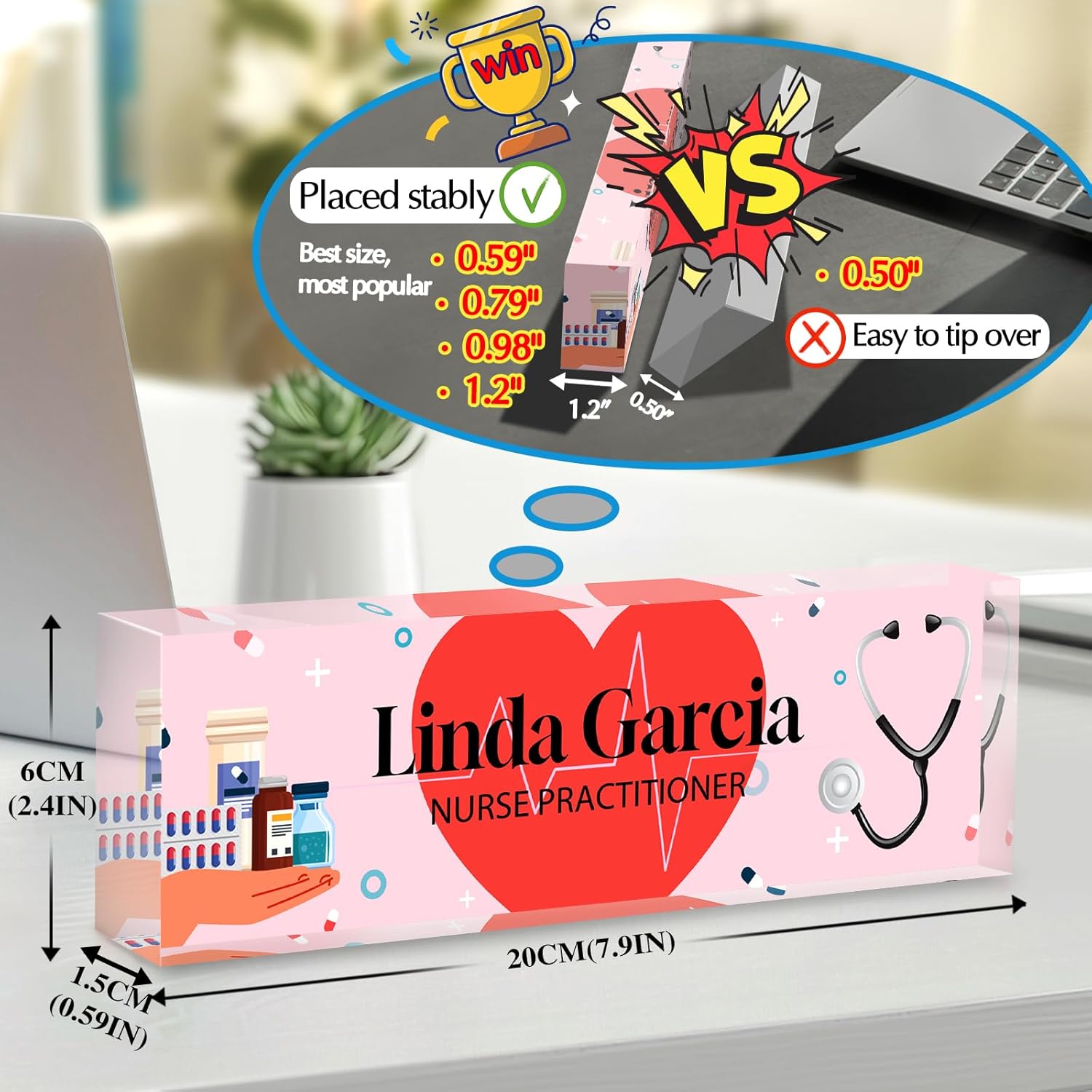 - 【Thickness upgraded to 0.79-1.18 inches】 According to market research, most people who received 0.59-inch thick acrylic nameplates would have problems with instability and easy to tip over, which would bring a terrible shopping experience. From the customer's perspective, we pause Selling a 0.59-inch nameplate, we provide 0.79-inch/0.98-inch/1.18-inch thick acrylic for selection. The 1.18-inch size is the most popular gift size, More fashionable and atmospheric, We aim to bring your vision to life!