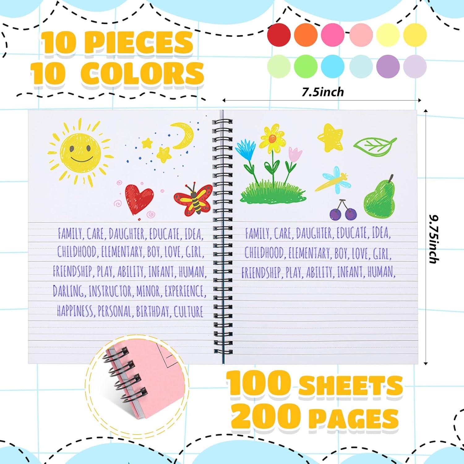Henoyso 10 Pcs 100/50 Sheets Primary Composition Notebook K-2 Bulk Spiral Primary Journal Drawing Handwriting Practice for Kids Kindergarten 1st 2nd Back to School Supplies (Stylish Color,100 Sheets)