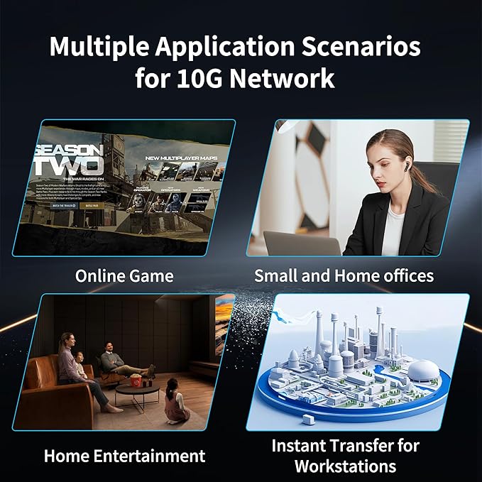 - 【Compliant with Network Standar】,Supports 10G speed over Cat6A or better cabling,2.5G/1G speed over Cat5e or better cabling.