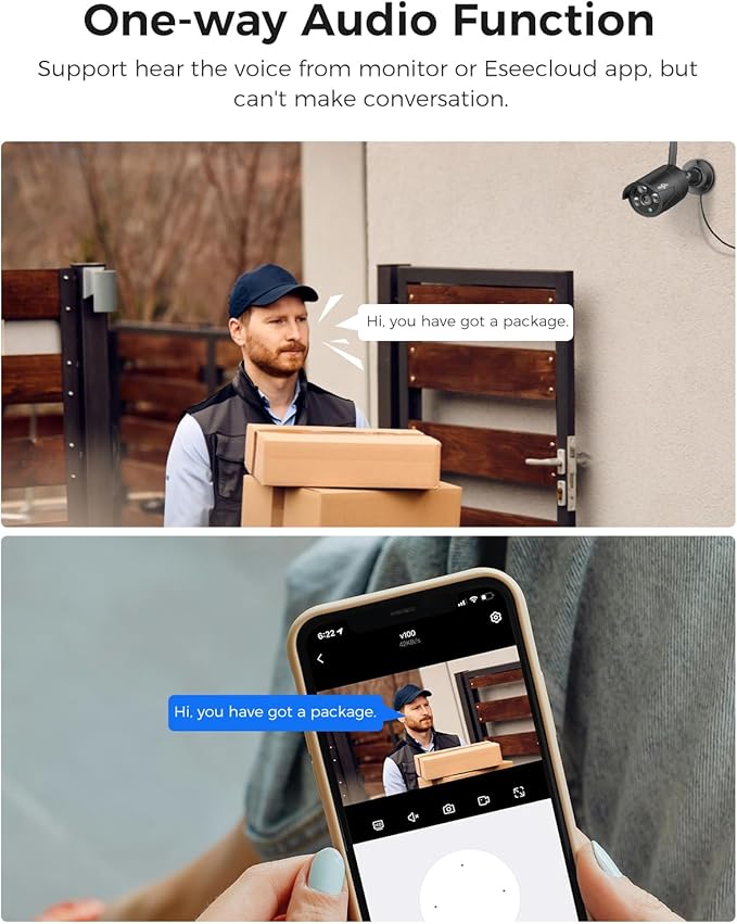 - 【Night Vision & One-Way Audio】 4K NVR + 5MP cameras capture sharp details even in darkness, eliminating blind spots. Surveillance camera system enhance security measures with the listen in real-time without revealing your presence-no accidental mic leaks or unwanted attention