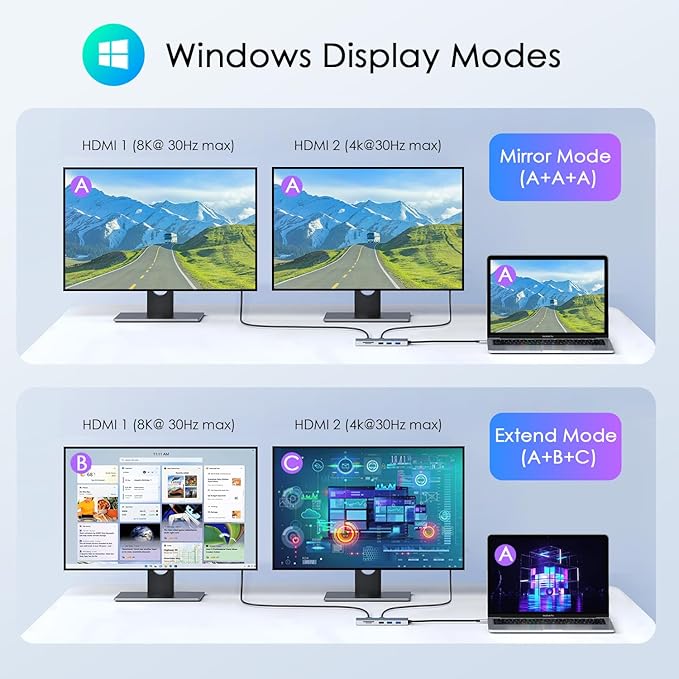 - Screen Output and High-Resolution Display: This USB-C hub supports 4K@60Hz (3840 x 2160) and is compatible with 2K@120Hz, 1080P. It allows you to mirror or extend your MacBook Air display to external monitors, TVs, or projectors via HDMI. Note: Your USB-C device must support video output via DisplayPort Alt Mode or Thunderbolt; otherwise, images wonβt display.