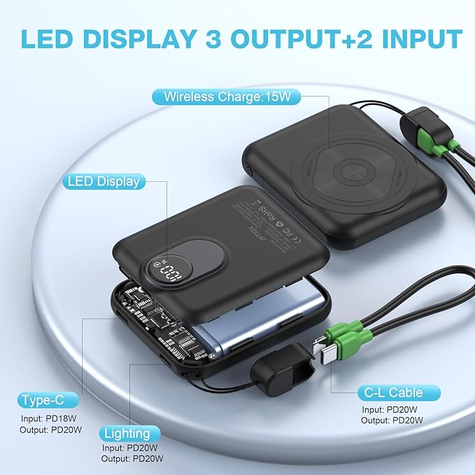 - 【Fast Wireless&Wired Charging】Support 5W, 7.5W, 10W and 15W Max wireless charging and max 20W USB-C&IOS output(use our Detachable USB C&iOS Dual Ports cable); support max 20W Lighting input(use our detachable USB C&iOS Dual Ports cable) and max 20w USB-C input; The mag-safe powerbank can charge 3 Devices at the same time, shared charging with no waiting.