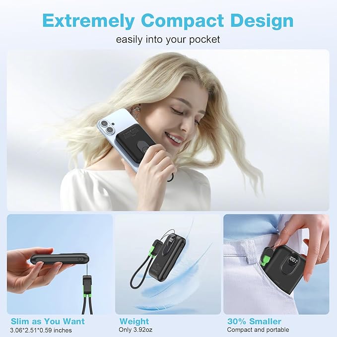 - 【Extremely Compact Design】 This magnetic portable charger power bank fits easily into your pocket, even while wearing skinny jeans. Due to its compact size of 3.06*2.51*0.59 inches, it will not block the camera. The lighter weight(only 3.92oz).its body like a credit card. The lightweight design lets you take it out without pressure. It's slim enough to put it in your pocket or in your handbag