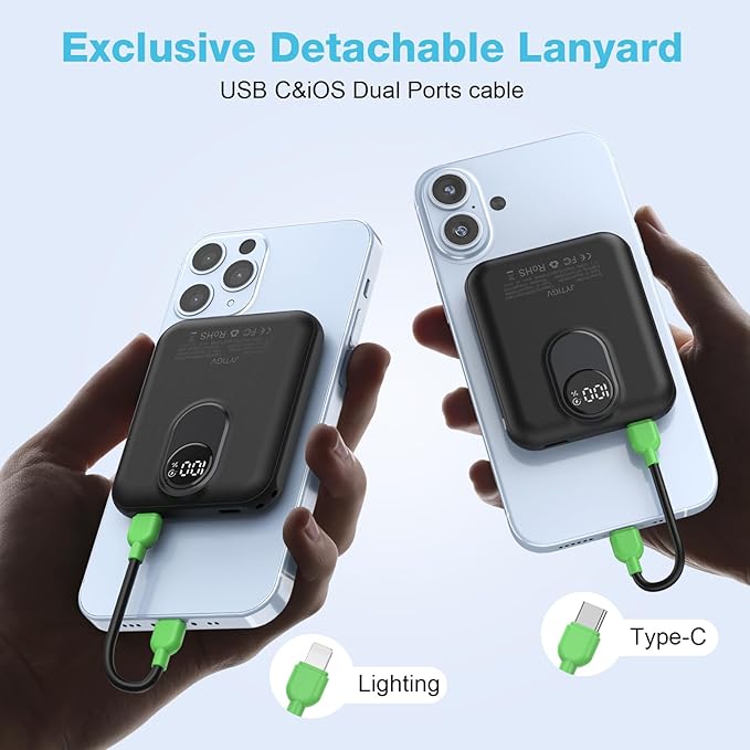 - 【Got USB C Recharging】This magnetic portable battery offers two recharging methods: you can use an extra USB-C cable plugged into the USB-C port of the magnetic battery pack to get a fast recharging, or use the detachable USB C&iOS Dual Ports cable(like a Lanyard come with the power bank) plugged into the IOS input&output port to get a fast recharging.