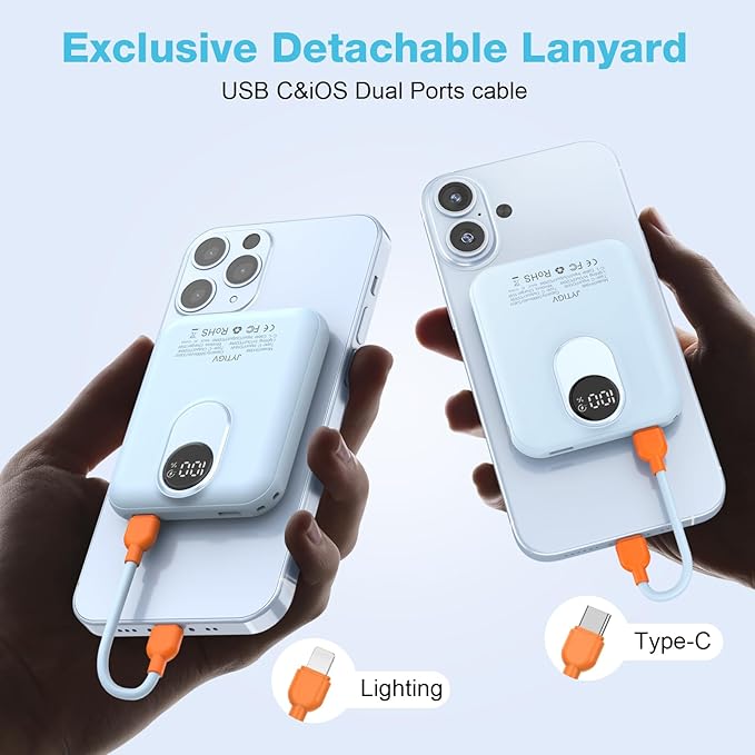 - 【Exclusive Detachable Lanyard USB C&iOS Dual Ports cable】This Magnetic portable phone charger features an innovative dual-port charging cable, which supports both input and output charging.It provides universal for iPhone and most Android devices.And since it's removable, you can easily use it with other power banks or devices.