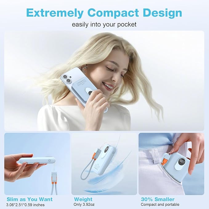 - 【Extremely Compact Design】 This magnetic portable charger power bank fits easily into your pocket, even while wearing skinny jeans. Due to its compact size of 3.06*2.51*0.59 inches, it will not block the camera. The lighter weight(only 3.92oz).its body like a credit card. The lightweight design lets you take it out without pressure. It's slim enough to put it in your pocket or in your handbag