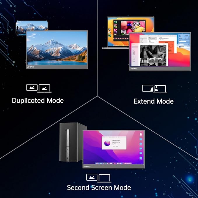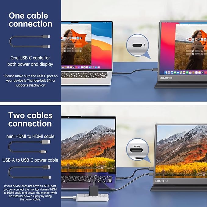 - 【Vivid 1080P FHD IPS Experience】The LUMIPIX portable monitor acting as a 15.6 inch IPS external monitor with 1920x1080 resolution and a 178° wide viewing angle. HDR mode enhances brightness and contrast, and featured low blue light and flicker-free tech to reduce eye strain—perfect for gaming, movies, or extended work sessions.