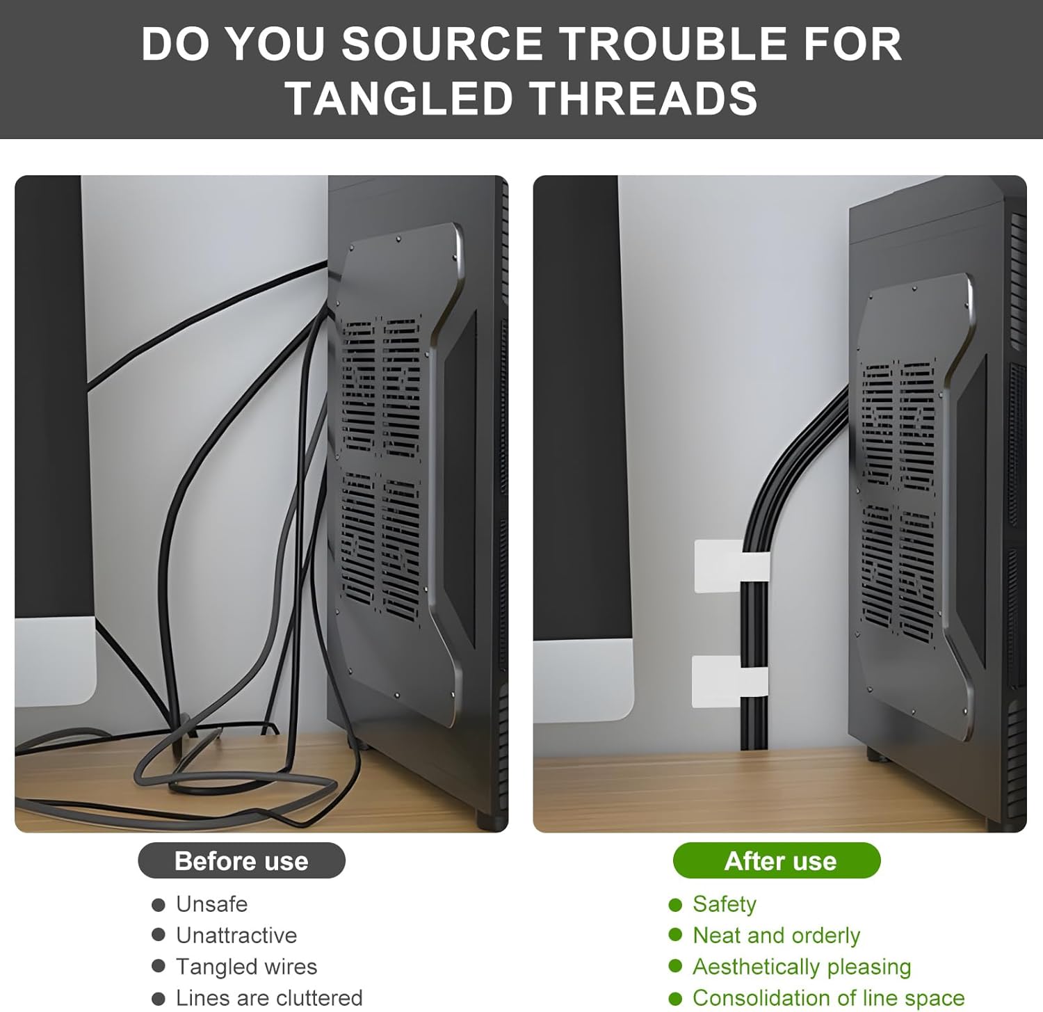 - Quickly secure and tidy tangled cords with self-adhesive hook-and-loop straps—no tools or complicated steps required. Perfect for power cords, USB cables, headphones, and electronics, saving time while boosting workspace efficiency.