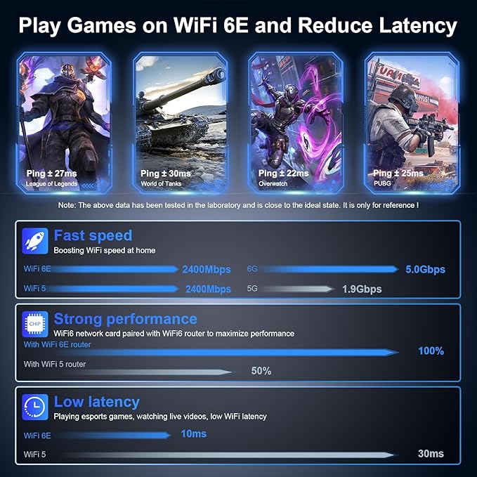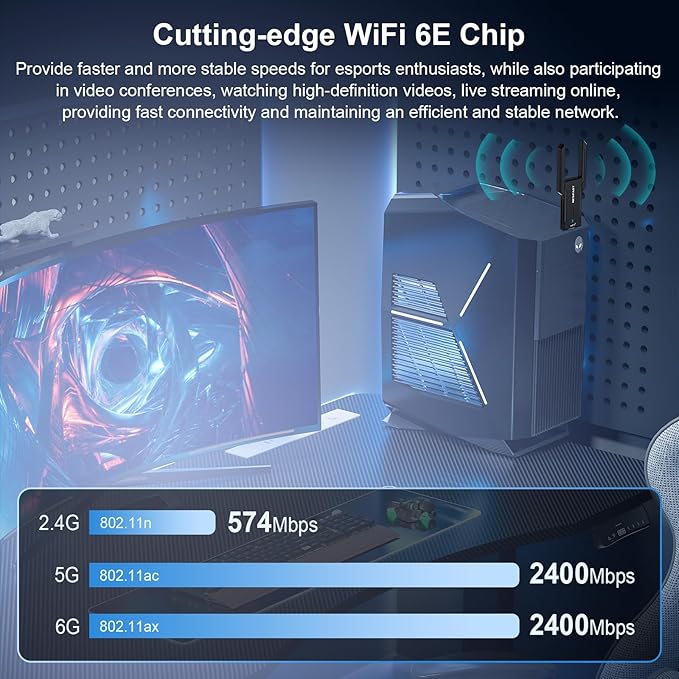- 【Blazing-Fast Speeds WiFi 6E Connectivity】The USB WiFi 6E Adapter for Desktop PC offers lightning-fast AX5400Mbps speeds, with 2402Mbps on 6 GHz, 2402Mbps on 5 GHz, or 574Mbps on 2.4 GHz. The clearer and broader 6 GHz band delivers faster speeds, greater flexibility, and less congestion.Ideal choice for upgrading your computer network adapter.