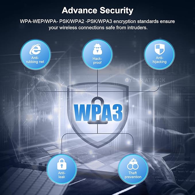 - 【Cutting-edge Technology】This usb WiFi adapter supports WiFi 6E, advanced WPA3 encryption technology.WiFi 6E is able to accommodate more non-overlapping channels, which efficiently reduces channel congestion and improves network performance. As a WiFi 6E network adapter, it also supports high-end technologies such as 4K-QAM, MU-MIMO and OFDMA, further increases network capacity and efficiency.