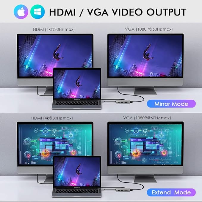 - Screen Output and High-Resolution Display: This USB-C hub supports 4K@60Hz (3840 x 2160) and is compatible with 2K@120Hz, 1080P. It allows you to mirror or extend your MacBook Air display to external monitors, TVs, or projectors via HDMI. Note: Your USB-C device must support video output via DisplayPort Alt Mode or Thunderbolt; otherwise, images wonβt display.