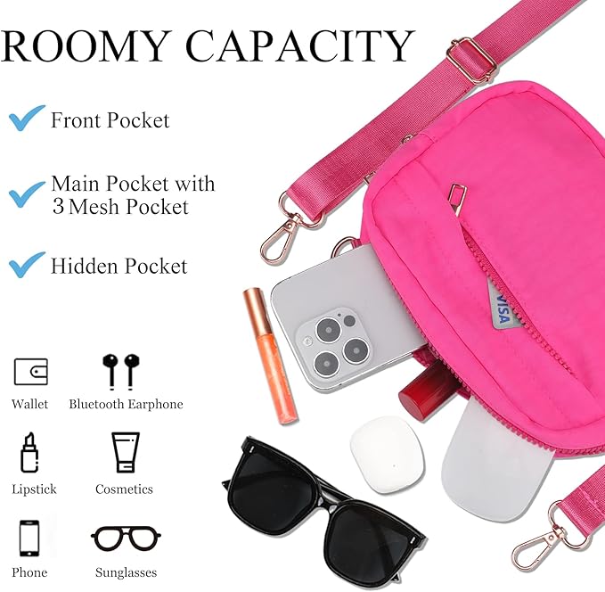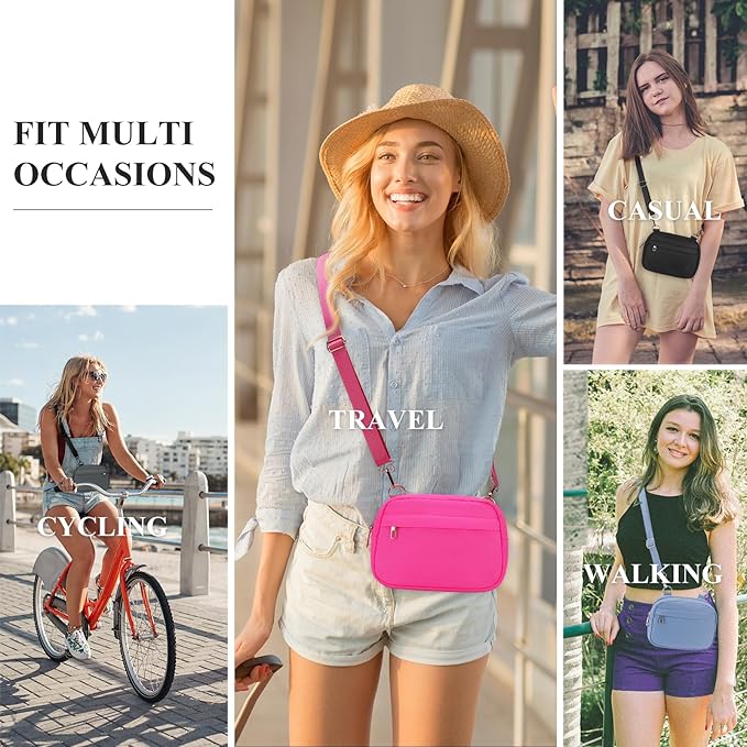 - ▶ Versatile Style Cross Body Bag, Adjustable Strap — Since the comfortable long strap is widely adjustable for most waist size(27” - 49”).There are many ways to wear this women belt bag - You can wear it in front of your waist, as a belt bag,back on your hip, slant across your chest or over You shoulder.It is a good way to free your hands,allows for different wearing styles.It is a great replacement for your wallet .