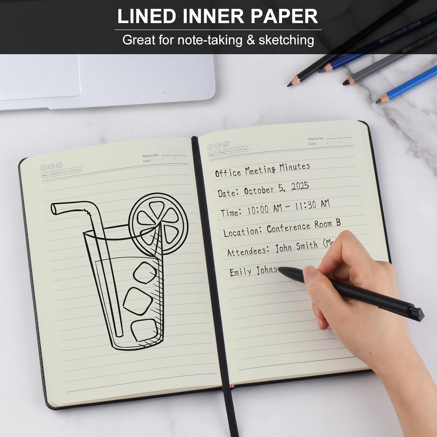 - Lined Journal Notebooks: 6 black hardcover notebook, 192 pages/96 sheets per notebook, adequate for work, meeting, studying. The paper of the leather notebook is thick enough that ink won't bleed through. The leather journals are the ideal notebook for work, school, meeting, travel and dairy