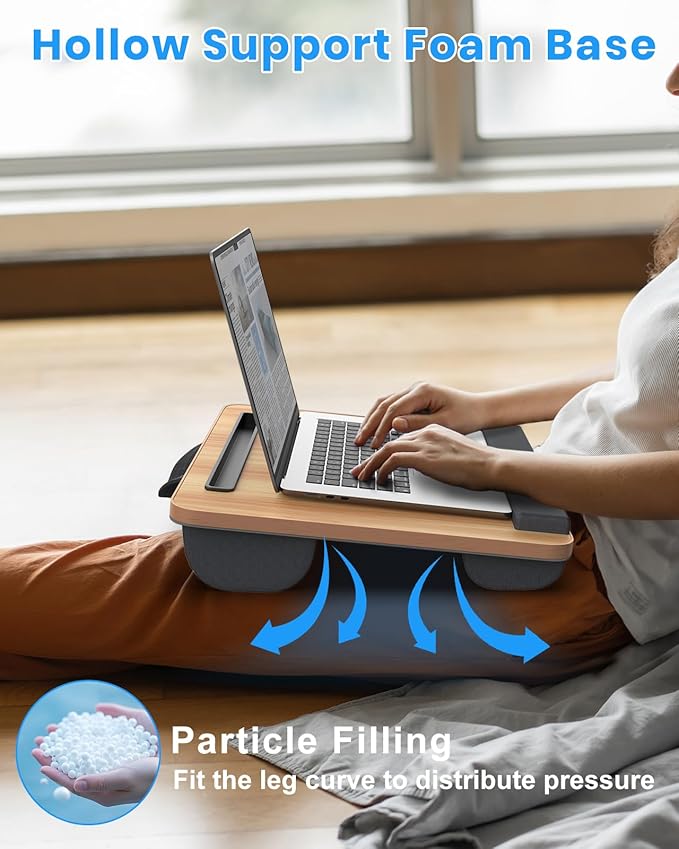 - Lap Desk for Laptop with Cushion: The hollow bottom design ensures ventilation, keeping you comfortable during extended use. Filled with high-quality pellets, it evenly distributes weight and eliminates pressure points.