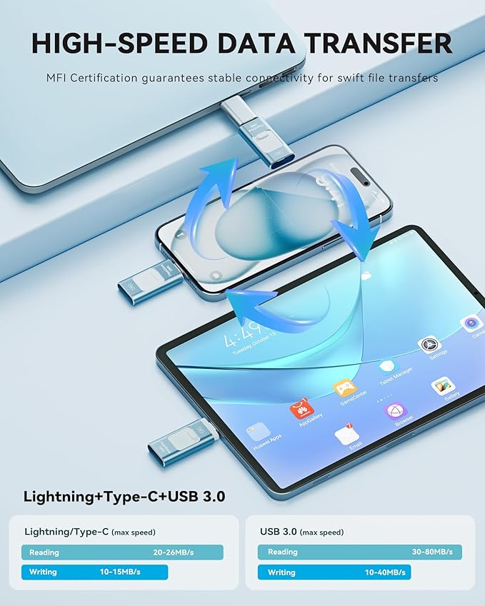 - Multi-interface usb stick device:This iphone photo transfer stick features Lightning/Type C/USB interfaces (with separate adapters), facilitating easy data transfer between different devices. No longer reliant on data cables, iTunes, or iCloud, you can securely store important files, photos, and other data. Never worry about running out of iPhone storage space again—you can also back up your files to a computer via the USB port for added security, and access and share them anytime.