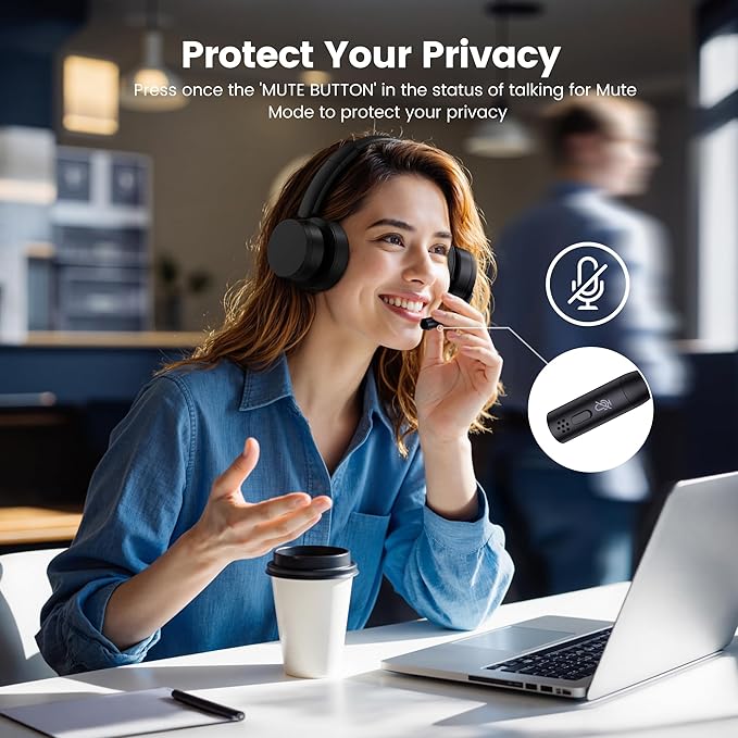 - One-Touch Mute for Instant Privacy—Stay in control of your conversations with a dedicated One-Touch mute button. Perfect for virtual meetings, confidential discussions, and the mobile office that needs reliable, uninterrupted communication anytime, anywhere. The intuitive MFB button on the call center headset also allows you to easily answer/end calls on your cellphone. A professional wireless headphones with mic that makes every call easy and convenient