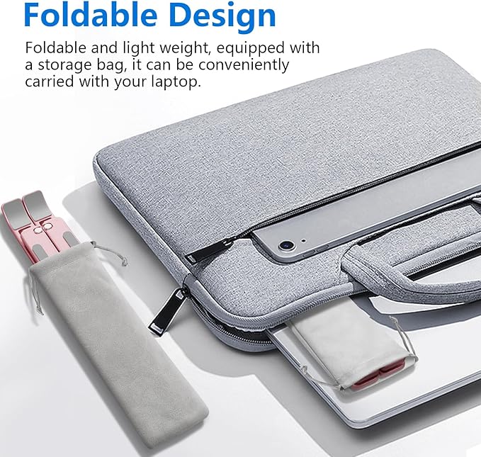 - 【Ultra Lightweight & Foldable Laptop Stand】 Weighing only 0.6lbs, this foldable laptop stand comes with a chic carrying pouch. The compact design fits easily in your tote bag, making it ideal for office, travel, or coffee shop use.