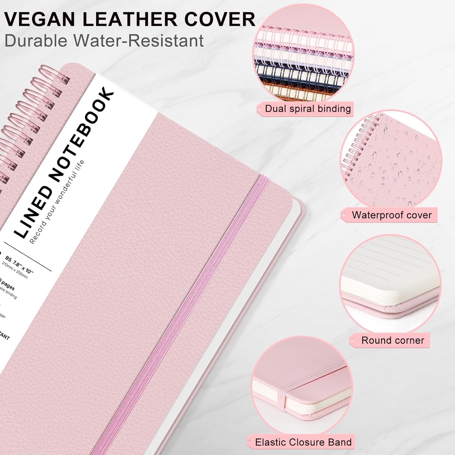 Lined Spiral Journal Notebook, B5 Hardcover Leather Notebook for Work, 7.8''×10'', 100GSM Thick Paper Spiral Bound Journaling Notebooks for Women & Men Office School Note Taking Business, Pink