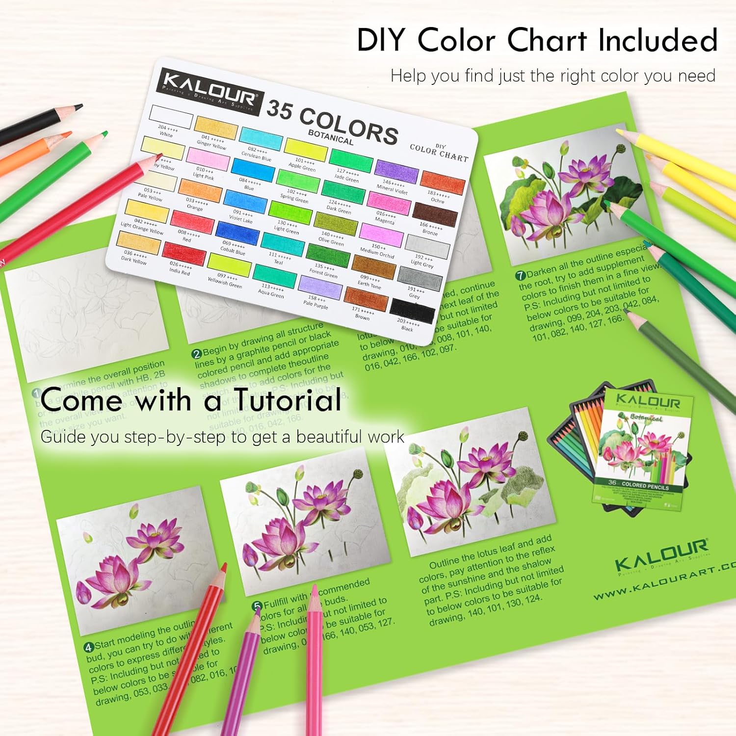 - 【Premium Colored Pencil Set】: Includes 35 vibrant colored pencils, 1 colorless blender pencil, 1 step-by-step tutorial, and 1 DIY color chart.